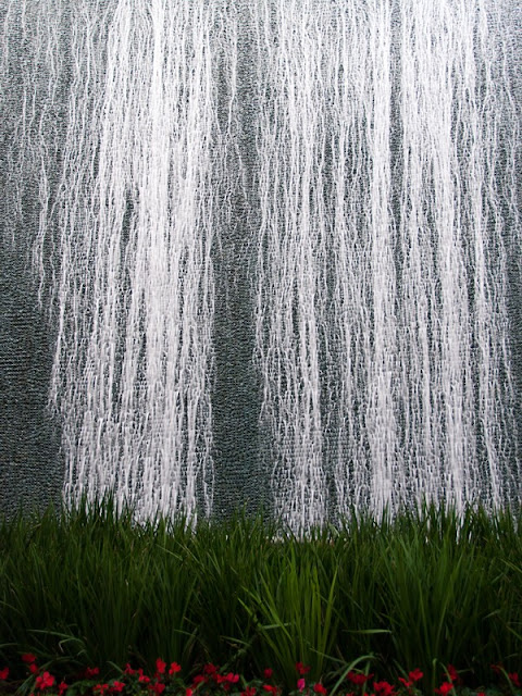 На снимке фонтан внизу справа кажется невзрачным, но на самом деле от него глаз не оторвать ‒ струи взлетают, зависают, а потом падают в непрерывно меняющемся свете прожекторов. Еще интересно, что стена в нижней части фотографии это тоже своеобразный фонтан ‒ нити воды тянутся по рифленой поверхности: